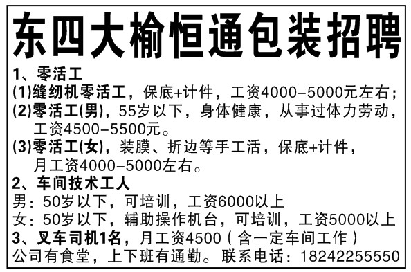 东四大榆恒通包装招聘