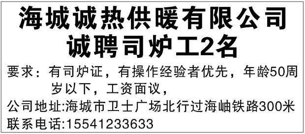 要求有司炉证,有操作经验者优先,年龄50周岁以下,工资面议,